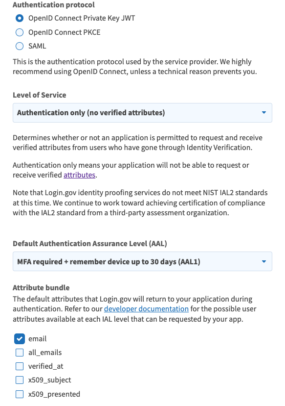 - Attribute bundle: Select the default attributes for Login.gov to return during authentication. Select at least email, profile, and profile:email.