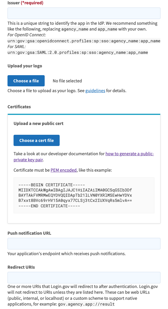 - Type of Identity Verification: The required level of identity assurance available for this application. Select ial/1 to allow self-asserted users without identity verification. Select ial/2 to require identity-proofed Login.gov identities.