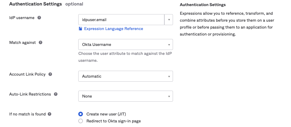 - IdP username: This is the expression (written in Okta Expression Language) that is used to convert an IdP attribute to the application user's username. This IdP username is used for matching an application user to an Okta User.