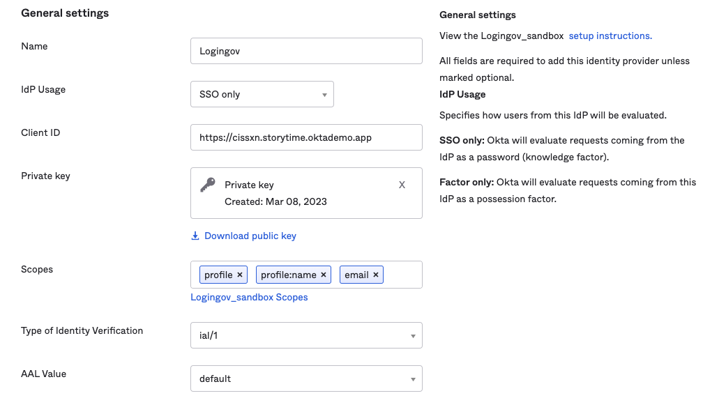 - Scopes: Leave the defaults (profile, profile:name, email) for IAL1 assurance. These scopes are included when Okta makes an OpenID Connect request to the IdP. See Login.gov OIDC scopes for required attributes
