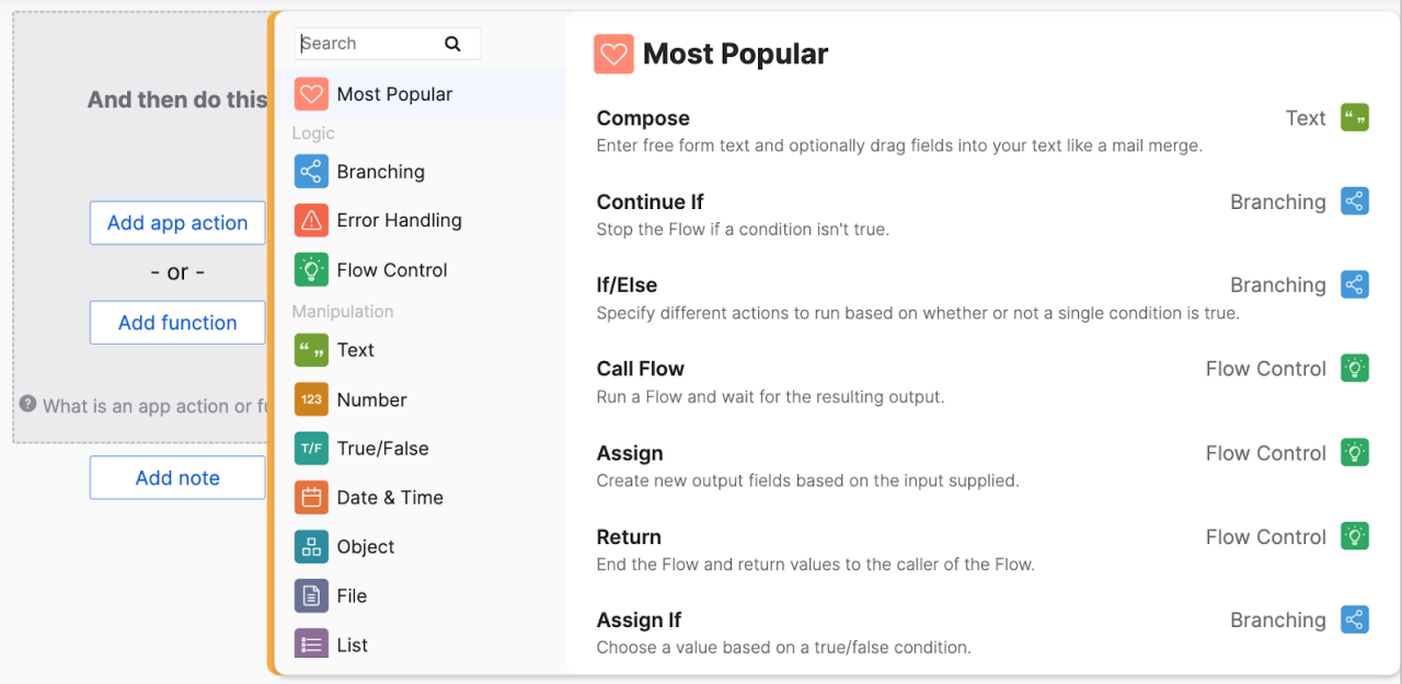 First, determine how to trigger a flow. You have several options: on event, on schedule, and an API endpoint. Then, once you have initiated a flow, use actions (from connectors) to call other services, and functions to edit and create data.