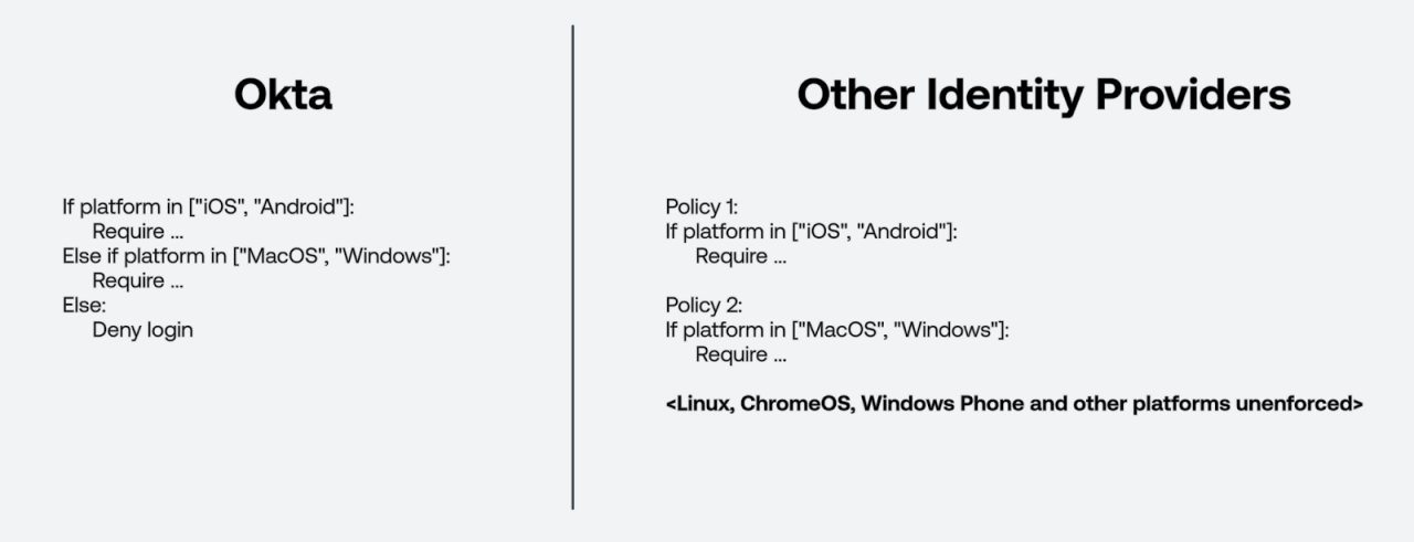 Alors qu'Okta utilise un modèle basé sur la priorité pour configurer les politiques d'authentification, d'autres fournisseurs configureront des politiques « globales » avec l'action « la plus sévère » prenant effet.