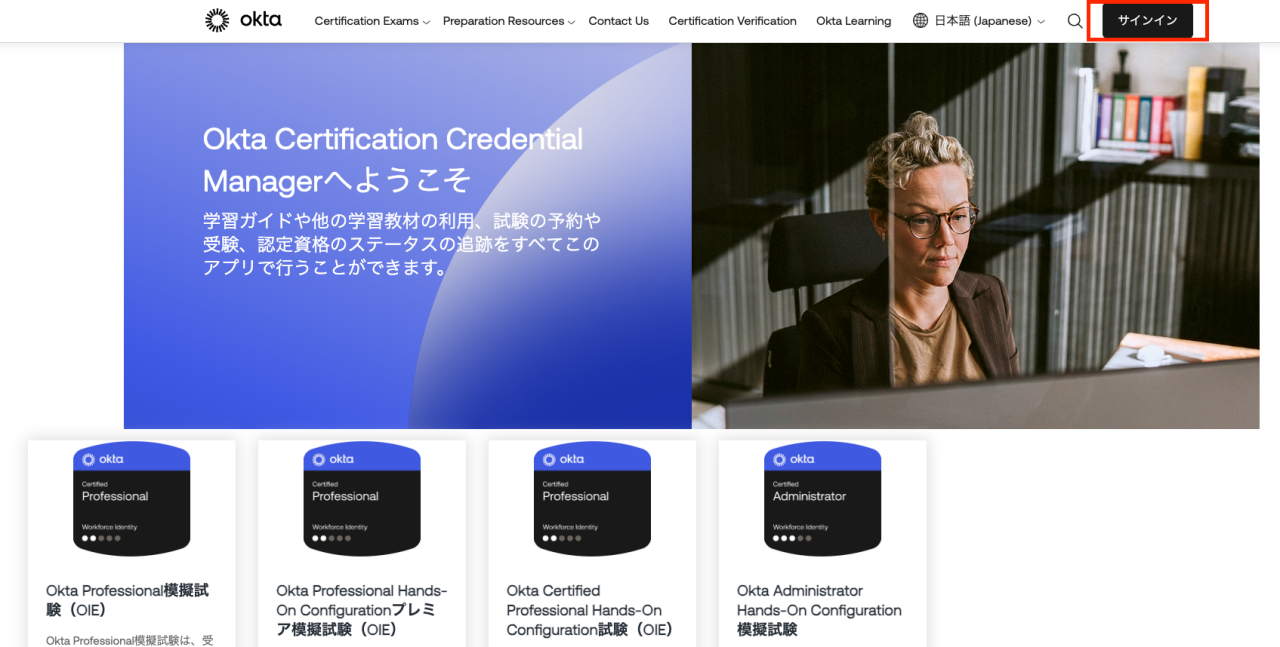 Okta Certification Credential Manager のサイトにアクセスします。画面右上の 「サインイン」 ボタンをクリックし、ご自身の Okta アカウント (パートナー様はご自身の Partner アカウント) でサインインしてください。