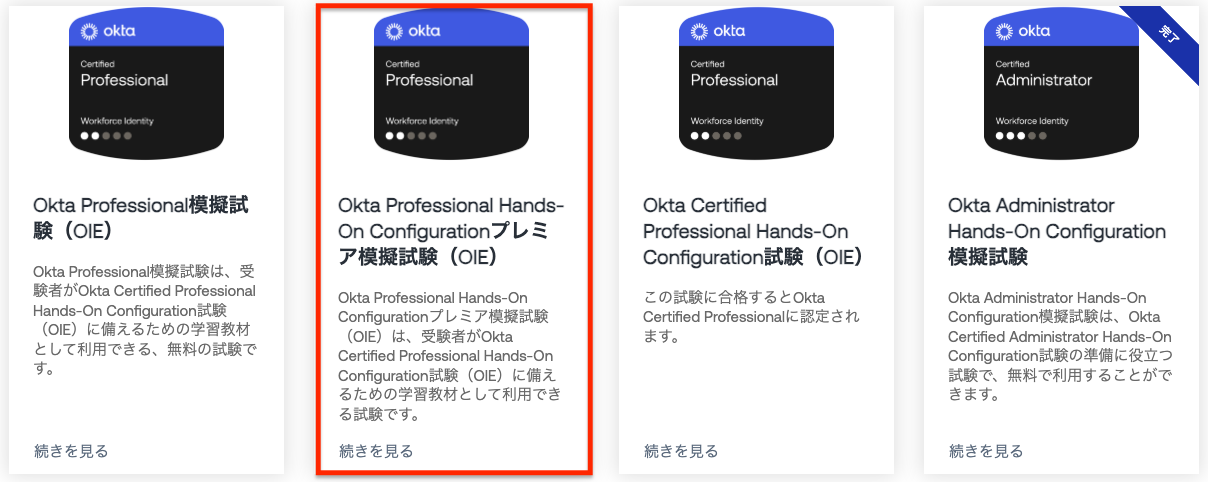 サインイン後、Okta Certified Professional および Okta Certified Administrator の模擬試験および本試験についてのコンテンツが表示されます。ここでは各コンテンツの受験ステータスも管理されており、完了したコンテンツについては 「完了」 という表示が追記されるようになります。