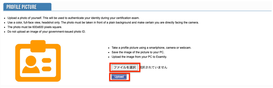 続いて PROFILE PICTURE (プロファイル写真) の設定を行います。「ファイルを選択」ボタンをクリックし、ご自身の写真をアップロード後、「Upload」ボタンをクリックしてください。