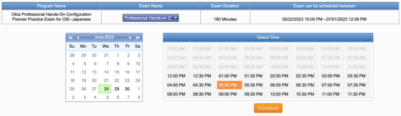 試験を選択すると受験希望日時の選択画面が表示されます。模擬試験の場合は試験監督が付きませんため、どの時間帯でも受験が可能です。受験したい日付と開始時間を選択して、「Schedule」 ボタンをクリックしてください。本当に予約をしてもいいですかというポップアップが表示されますので、「Yes」 をクリックして進めてください。
