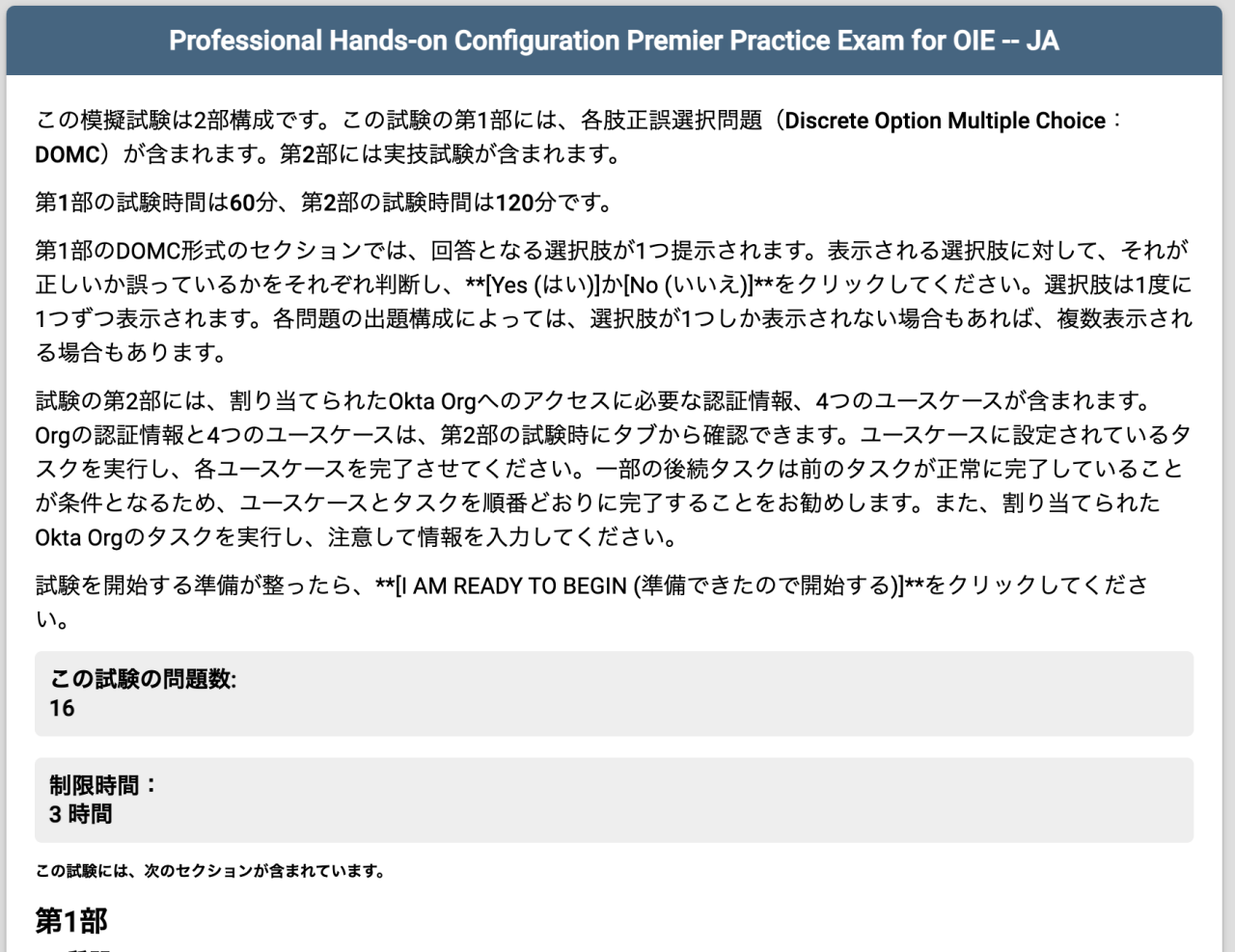 ここからは実際の模擬試験が始まります。問題文を注意深く読みながら回答を進めてください。試験は二部構成になっており、一部は選択問題、二部はハンズオンとなります。二部まで進めると画面下部に 「試験を提出する」 ボタンが表示されますので、回答が終わった後は任意のタイミングで終了することができます。
