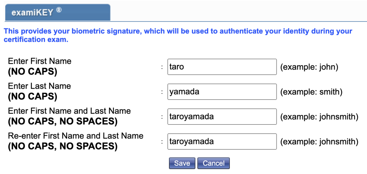 最後に examiKEY (署名) の設定を行います。examiKEY 配下の 「Edit」 ボタンをクリックしてください。ここではご自身のファーストネーム、ラストネーム、ファーストネームとラストネームをスペースを挟まずに繋げた文字列を入力します。全て小文字のアルファベットで入力してください。例えば名前が Taro Yamada だった場合は以下のような入力になります。入力が完了しましたら 「Save」 ボタンをクリックしてください。
