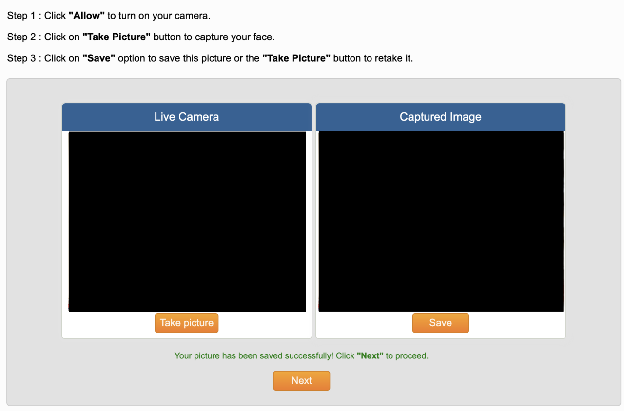 受験者の撮影画面が表示されます。ブラウザからカメラの利用許可を求められた場合は許可して、撮影が可能な状態にしてください。ご自身が写っていることを確認し、「Take picture」 をクリックしてください。撮影された写真が右側に表示されますので、問題なければ 「Save」 をクリックしてください。その後、画面下部に 「Next」 ボタンが現れますので、クリックして先に進めてください。
