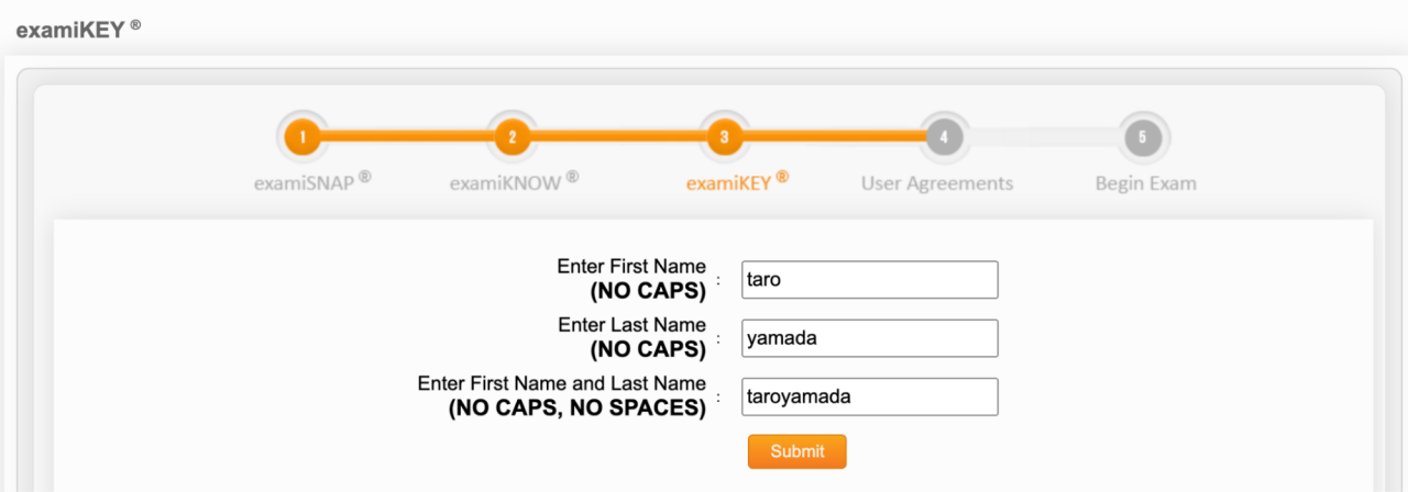 続いて ExamiKEY (署名) を入力する画面が表示されます。こちらもプロファイルに設定したとおりに、小文字アルファベット、スペースなし、で入力してください。入力後、「Submit」 をクリックしてください。