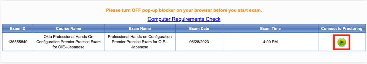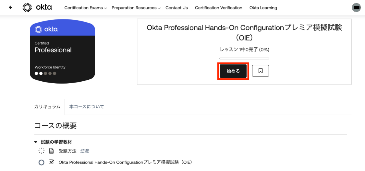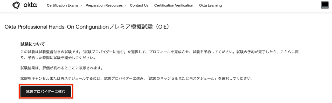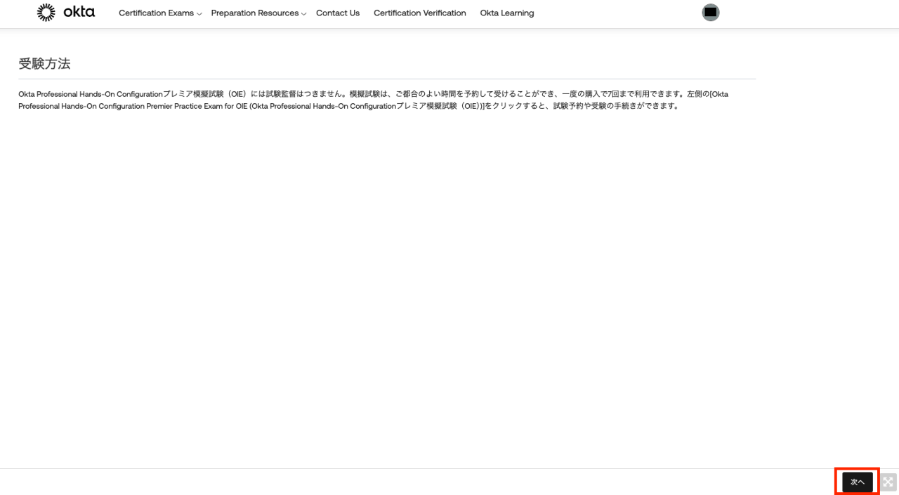 模擬試験での学習が完了しましたら、いよいよ本試験に進みます。https://certification.okta.com にアクセスし、「Okta Certified Professional Hands-On Configuration 試験 (OIE)」 に進みます。