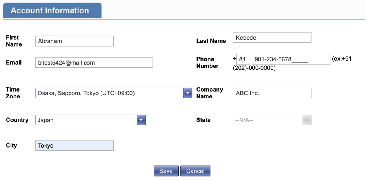 プロファイル画面が表示されます。まずは基本情報を更新するため、Account Information 配下の 「Edit」 ボタンをクリックしてください。編集画面に切り替わりましたら、ご自身の情報 (メールアドレス、タイムゾーン、電話番号など) を入力または更新し、「Save」 ボタンをクリックしてください。