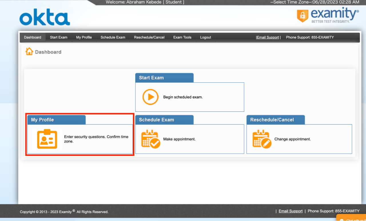 ここからは 「examity」 という試験プラットフォームを提供する外部プロバイダのサイトで操作を進めていきます。試験を受けるためにはプロファイルの設定が必要ですので、 「My Profile」 をクリックします。