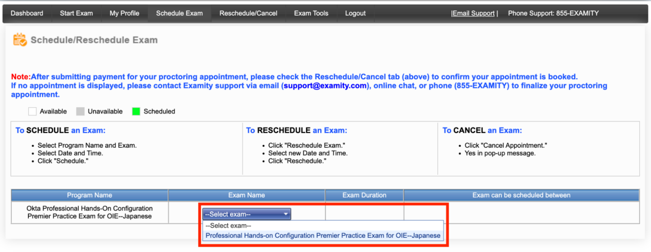 試験予約の画面が表示されます。受験する試験を選択するため、Exam Name から該当の試験を選択してください (本手順どおりであれば一つしか選択肢は出てこないはずです) 。