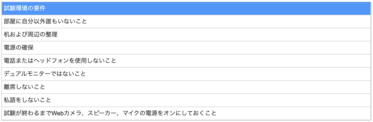 予約が無事完了しますと、予約内容や試験環境の要件に関するメールが届きます。試験前までに内容をご確認ください。特に試験環境の要件は以下のように定義されていますので、事前に要件に合う部屋を確保してください。