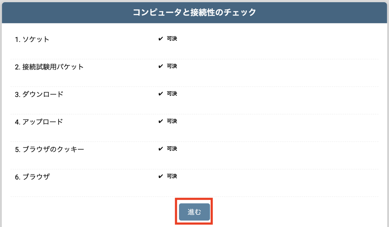 ここからは実際の模擬試験の画面に遷移します。自動で環境のチェックが走り、全ての項目が 「可決」 となったことを確認して、「進む」 ボタンをクリックしてください。