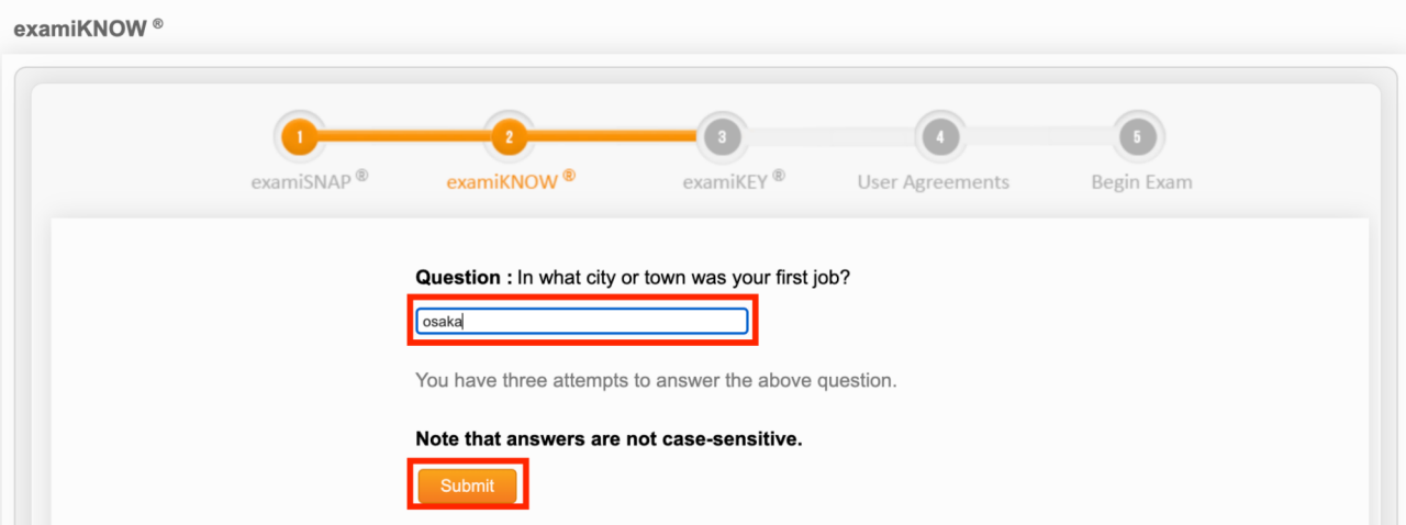 先にプロファイル登録時に設定した examiKNOW (秘密の質問) の入力画面が表示されます。設定した三つの内の一つを聞かれますので、設定した回答を入力して 「Submit」 をクリックしてください。