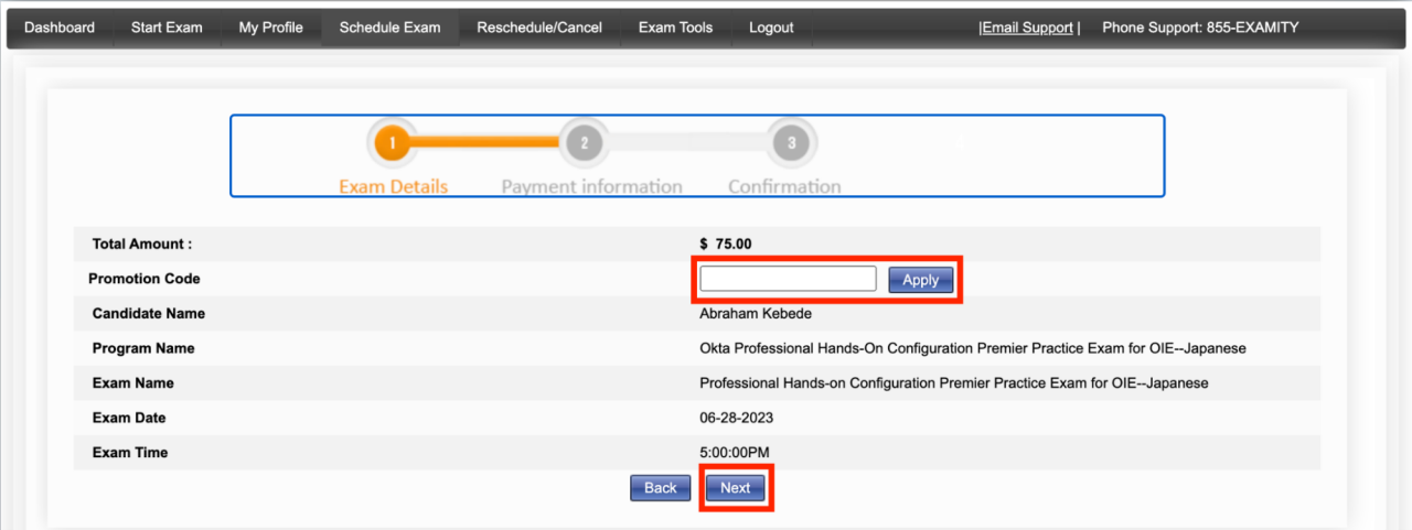 試験名や受験日時、受験料についての画面が表示されます。バウチャーコードをお持ちの方は Promotion Code にコードを入力して 「Apply」 をクリックしてください。有効なバウチャーコードの場合、受験料が更新されます。お持ちでない方は空欄のままで問題ありません。表示内容に問題がなければ 「Next」 ボタンをクリックしてください。