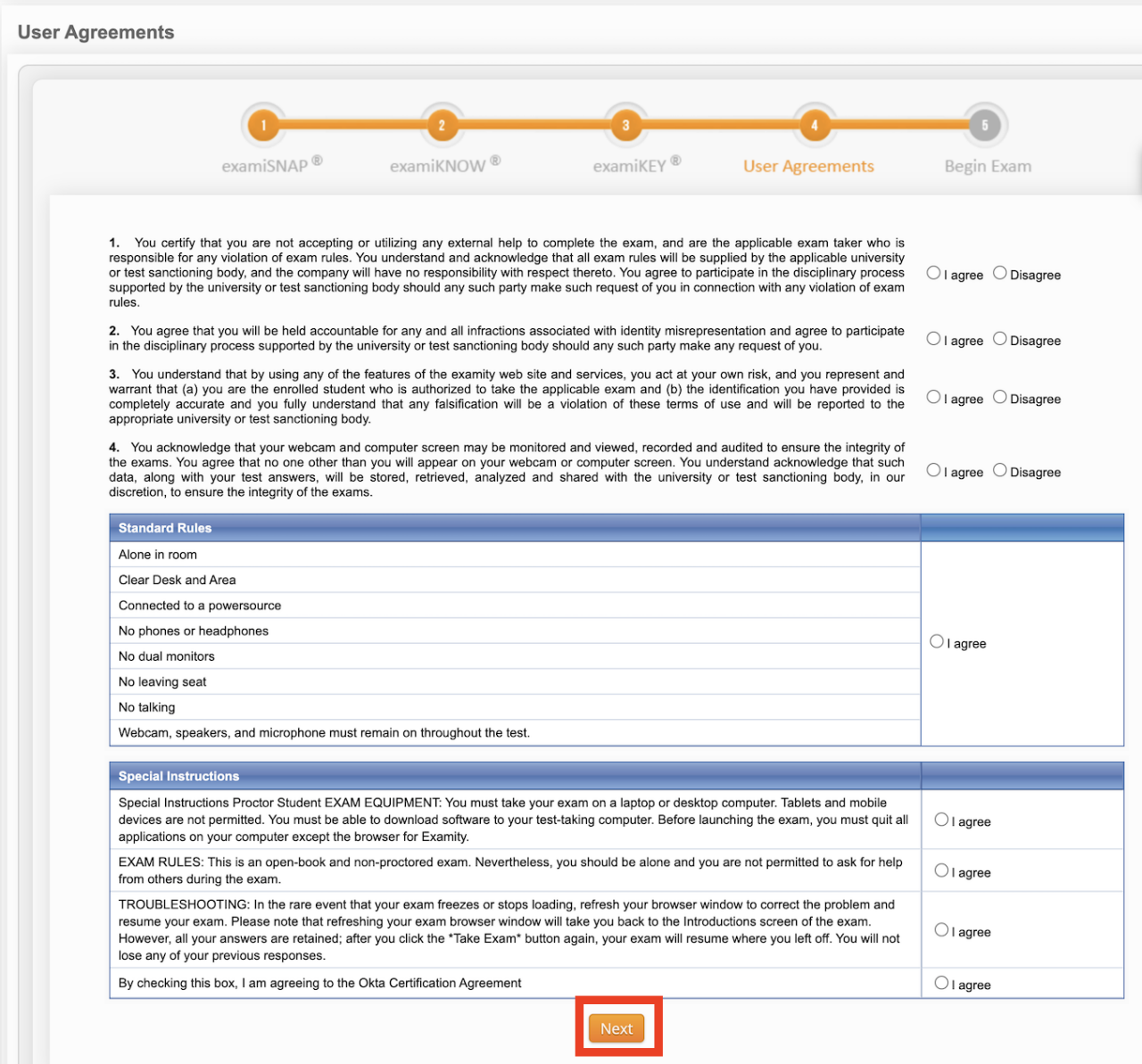 最後に User Agreements (同意確認) の画面が表示されます。内容をご確認の上、各質問に 「I agree」 もしくは 「Disagree」 をチェックしてください。全ての質問への回答が終わりましたら、「Next」 ボタンをクリックしてください。