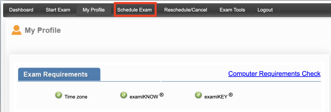 入力完了後、画面上部の Exam Requirements 配下の三つの項目が緑のチェックマークになっていることを確認してください。もし赤いマークが付いている場合は、その項目を再度編集してください。以上でプロファイルの設定は完了となり、続いて模擬試験の予約に進むため 「Schedule Exam」 をクリックしてください。
