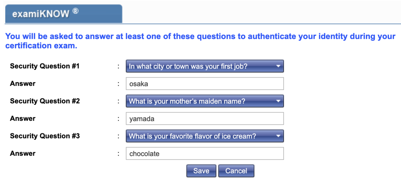続いて examiKNOW (秘密の質問) の設定を行います。examiKNOW 配下の 「Edit」 ボタンをクリックしてください。三つの質問と回答を設定する必要がありますため、Security Question #1-#3 からお好きな質問を選択し、それぞれへの回答を Answer に英語で入力してください。入力後、「Save」 ボタンをクリックしてください。