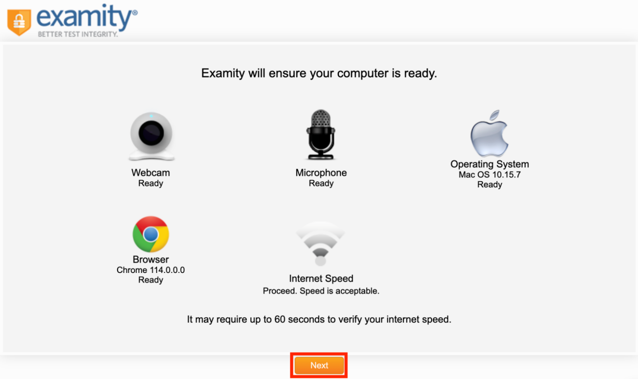 画面遷移すると自動的に受験環境のチェックが行われます。模擬試験では利用しませんが、本試験ではカメラ、マイクを常時オンにしておく必要がありますため、ここでもチェックされています。また、OS やブラウザ、ネットワークスピードもチェックされ、いずれかが不適合となると受験ができませんため、全ての項目が Ready になっていることを確認して、「Next」 をクリックしてください。