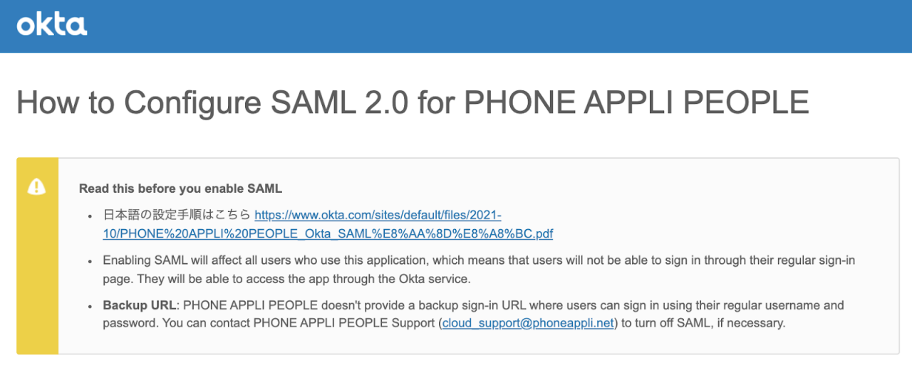 2021年10月26日に発表しましたとおり、株式会社PHONE APPLIが提供するWeb電話帳クラウドサービス「PHONE APPLI PEOPLE」(旧:連絡とれるくん) がOkta Integration Network(OIN)に登録されたことにより、SAMLによるシングルサインオン(SSO)連携が完了いたしました。