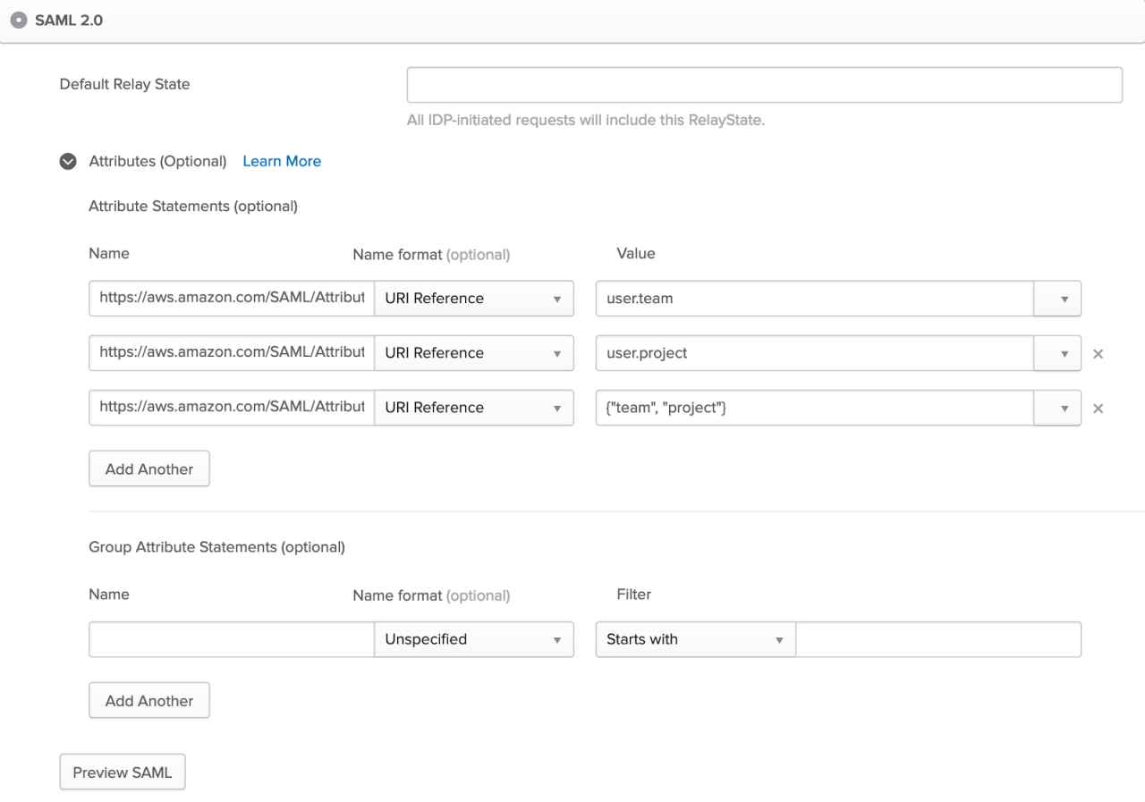 完成したら、SAMLアサーションで渡される属性の名前(この例では「team」と「project」)を反映させるために、AWS IAMでポリシーを作成または更新する必要があります。この方法の例については、セッションタグに関するAWSのドキュメントを参照してください。