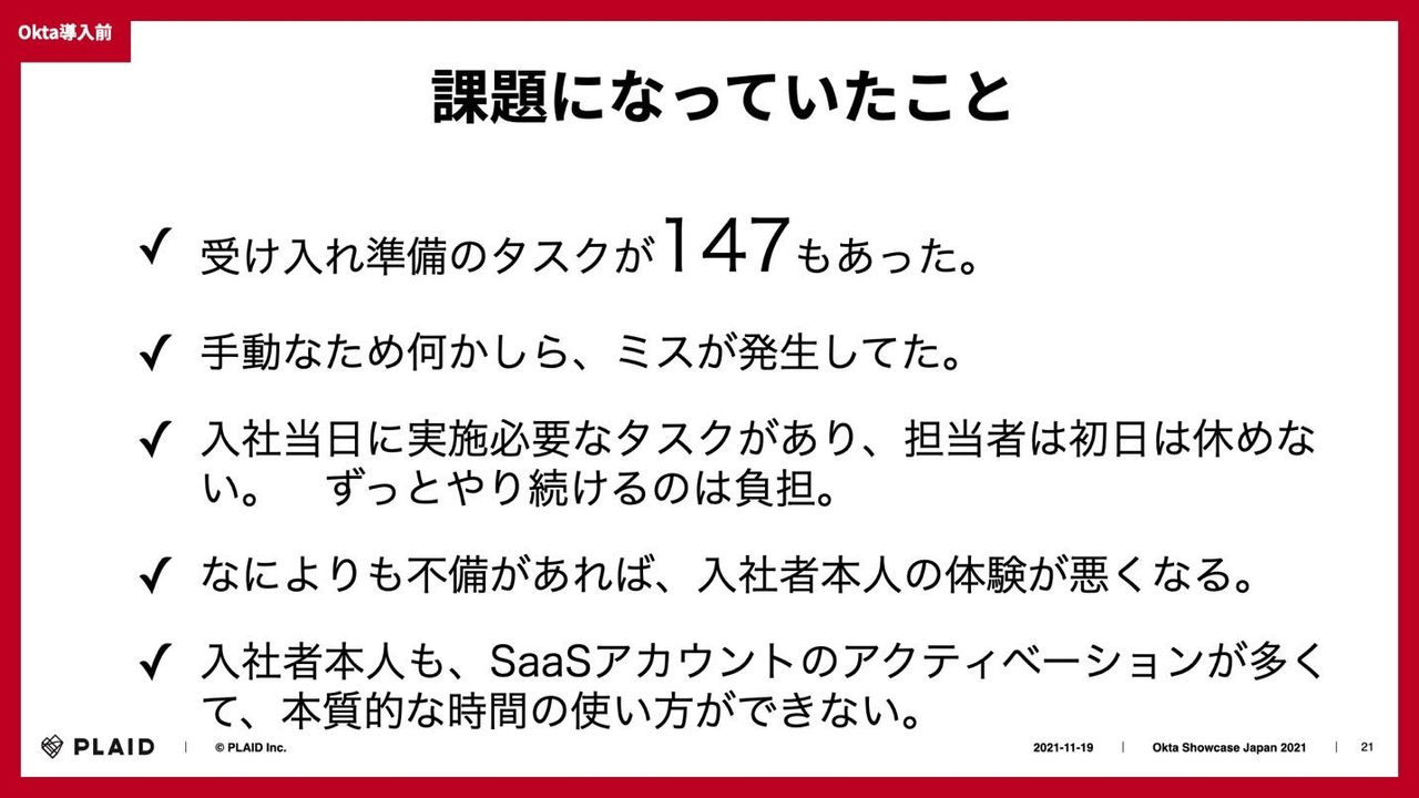Okta導入前の課題について同氏は、「受け入れ準備のタスクが147もあった」「手動なため、何かしらミスが発生していた」「入社当日に実施する必要があるタスクがあるため、担当者は入社初日は休めなくなり大きな負担になっていた」「設定不備等が生じることで入社者の体験が悪くなる」「入社者本人もSaaSアカウントのアクティベーションが多く、本質的な時間の使い方ができない」という5点を挙げました。