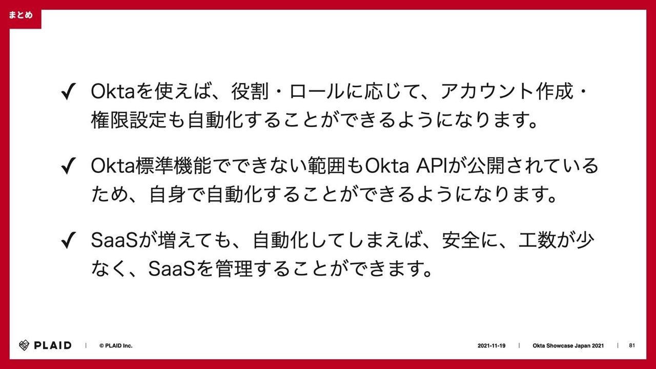 講演の最後に梶原氏はまとめとして、「Oktaで役割やロールに応じたアカウント設定や権限決定ができるようになる」、「OktaではAPIが公開されているので、標準機能では出来ないようなきめ細かなプロセスも自動化することが可能」、「SaaSが増えていった場合でも自動化しておけば安全に少ない工数で管理できる」と語りました。