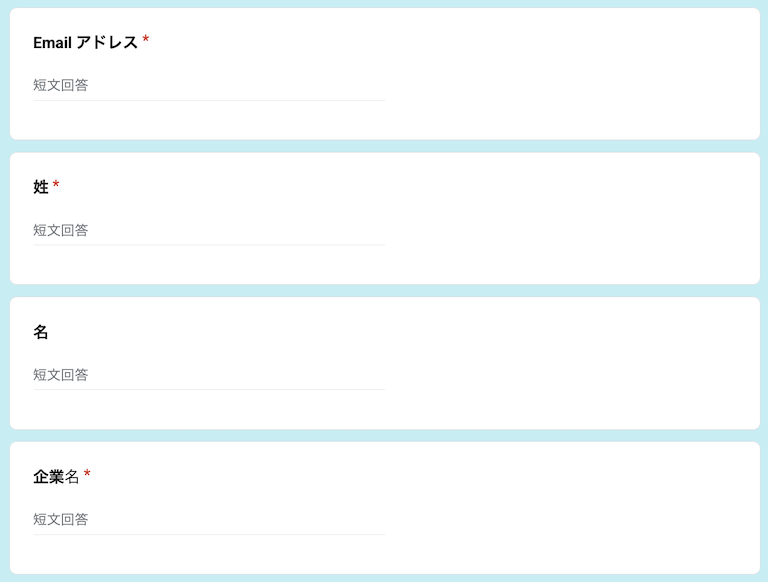 まずはGoogle Formsで作成した入力項目と同じ入力項目(Question)を作成します。フォームでは4つの項目を作りましたので、図のようにこちらも4つの項目になっています。