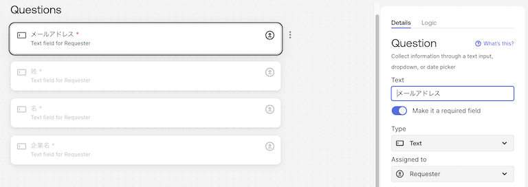 それでは順番に作成していきたいと思います。まずは、フォームの作成です。Oktaのユーザー登録には、姓(Lastname), 名(Firstname), メールアドレスが最低限必要となりますので、フォームの入力項目として作成します。これに加えて、承認者の判断に必要な情報や、Oktaの属性として登録しておきたい情報を任意に追加することもできます。今回は会社名を追加しました。