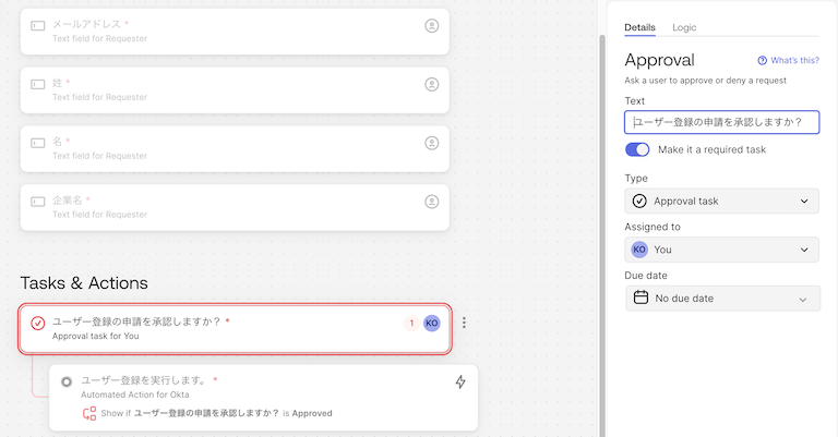 続けて、承認(Approval)を追加します。適当な文章を入力し、承認者を指定します。承認者は自由に設定してください。