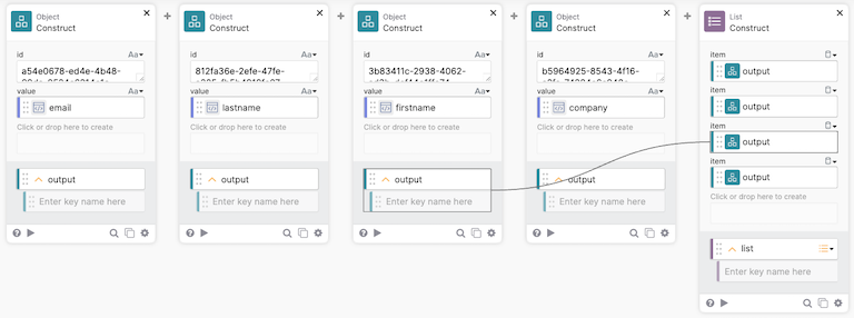まず最初に、Object - Construct カードを配置します。Click or drop here to crateと書かれている部分をクリックすると名称の変更、名称をidに変更します(初期値はinput 1)。この変更を確定するともう一つ項目がグレー表示されるため、同じ要領で名称をvalueに変更します。