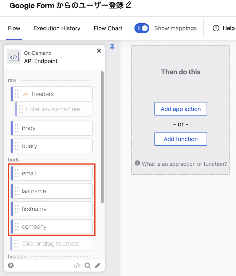 フォームへの入力内容を、YOUR_API_ENDPOINT_HERE 部分に入力したURLに送る単純なものですが、そのままだとフォームの入力項目タイトルが変数の値として日本語のまま使われるので(Workflowsはそのままでも対応できますが)、プログラムらしく4つの名称をそれぞれ email, lastname, firstname, company に置き換えてから送るようにしてあります。