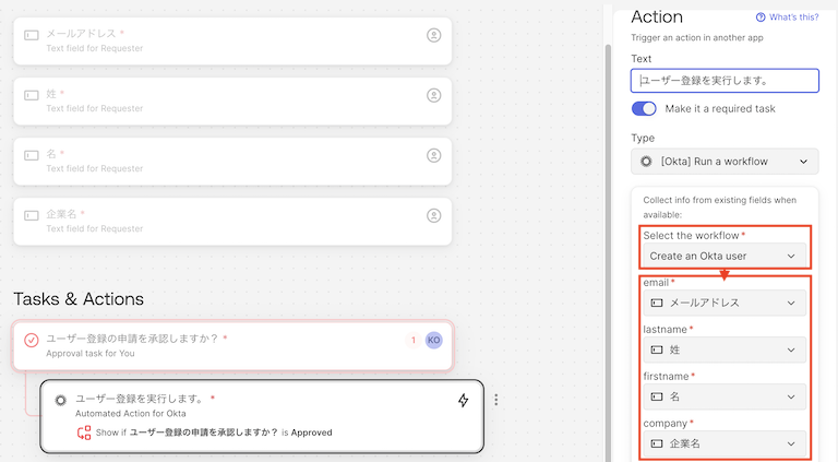 最後はWorkflowsを実行(Action>Run a workflows)を追加します。こちらも適当な文章を入力し、実行するフロー(Select the workflow)としてステップ4で作成したフロー(この例ではCreate an Okta User)を指定します。フローを選択すると、フローが受け取ることのできる変数が表示されるので、それぞれにQuestionで作った項目をマッピングします。