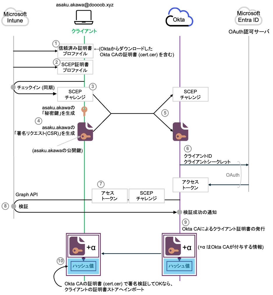 (10) クライアントは、受け取ったクライアント証明書の署名を、(1) の中にあるOkta CAの証明書で署名検証し、それが成功したら、クライアントの証明書ストアに保存します。