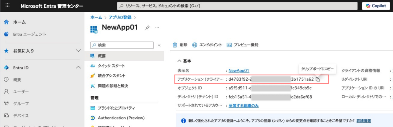 「アプリケーション (クライアント) ID」をコピーして、一時的にメモしておいてください。(後ほどOktaの設定で使います。)