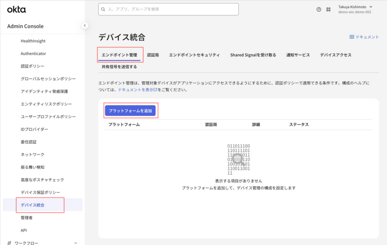 「セキュリティ」→「デバイス統合」→「エンドポイント管理」タブで、「プラットフォームを追加」をクリックします。
