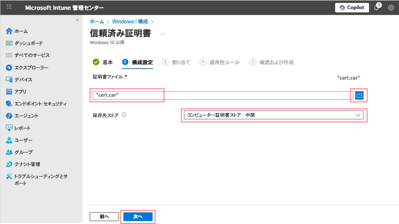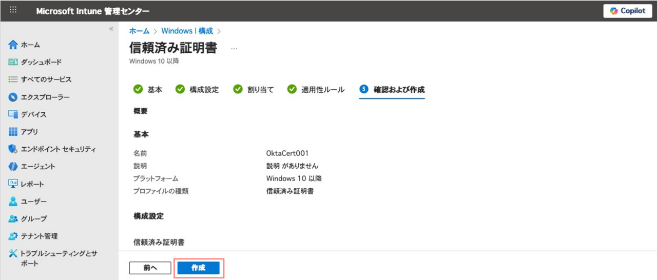 「構成」→「作成」をクリックして表示された右画面で、プラットフォームは「Windows 10以降」、プロファイルの種類は「テンプレート」、その下の検索フォームに「証明書」と入力して表示されたテンプレート名中から「信頼された証明書」を選択して、「作成」をクリックします。
