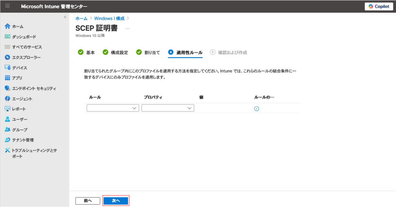 この「適用性ルール」の設定は必須ではないので「次へ」をクリックします。