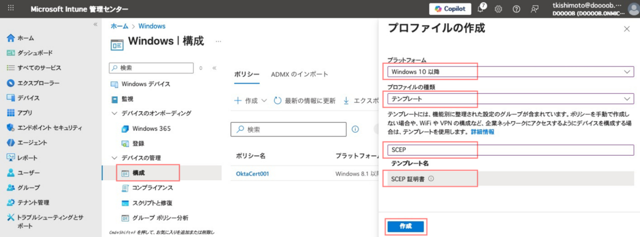 「構成」をクリックして表示された右画面で、プラットフォームは「Windows 10以降」、プロファイルの種類は「テンプレート」、その下の検索フォームに「SCEP」と入力して表示されたテンプレート名の「SCEP証明書」を選択して、「作成」をクリックします。