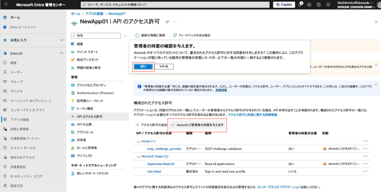 「XXXXXに管理者の同意を与えます」をクリックして表示された画面で「はい」をクリックします。