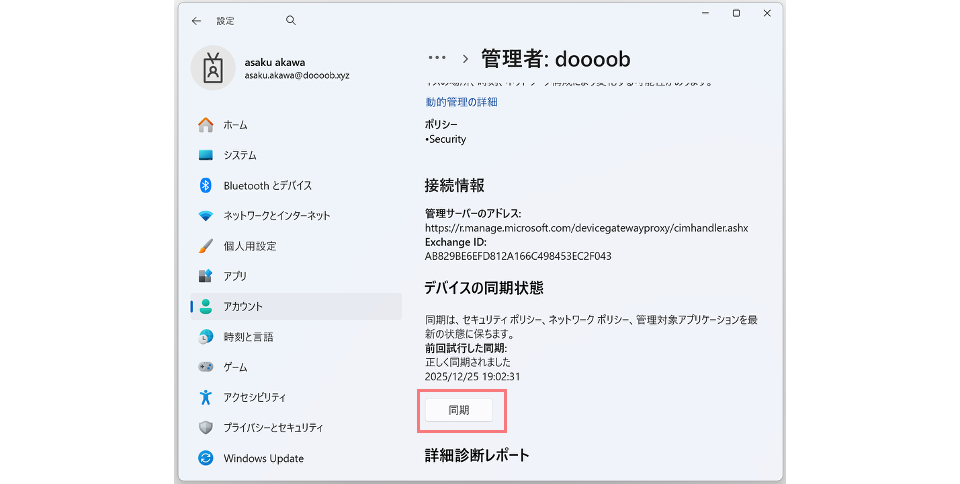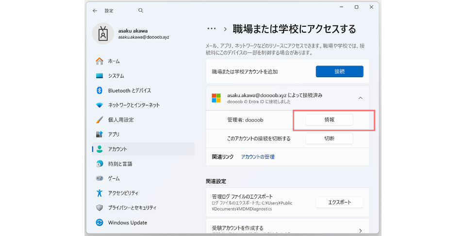 対象ユーザー (本記事では「asaku.akawa@doooob.xyz」) でWindowsクライアントにログインした状態で、「設定」→「アカウント」→「職場または学校にアクセスする」で表示された画面で、「asaku.akawa@doooob.xyzによって接続済み」のプルダウンで表示された、管理者: doooob の「情報」をクリックします。