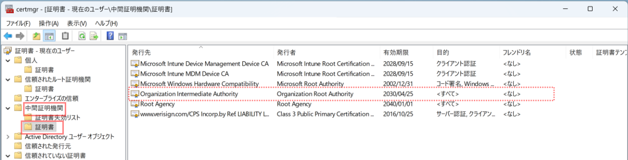ちなみにOkta CAの証明書は、「中間証明機関」→「証明書」フォルダに、「Organization Intermediate Authority」として存在しているものが該当します。
