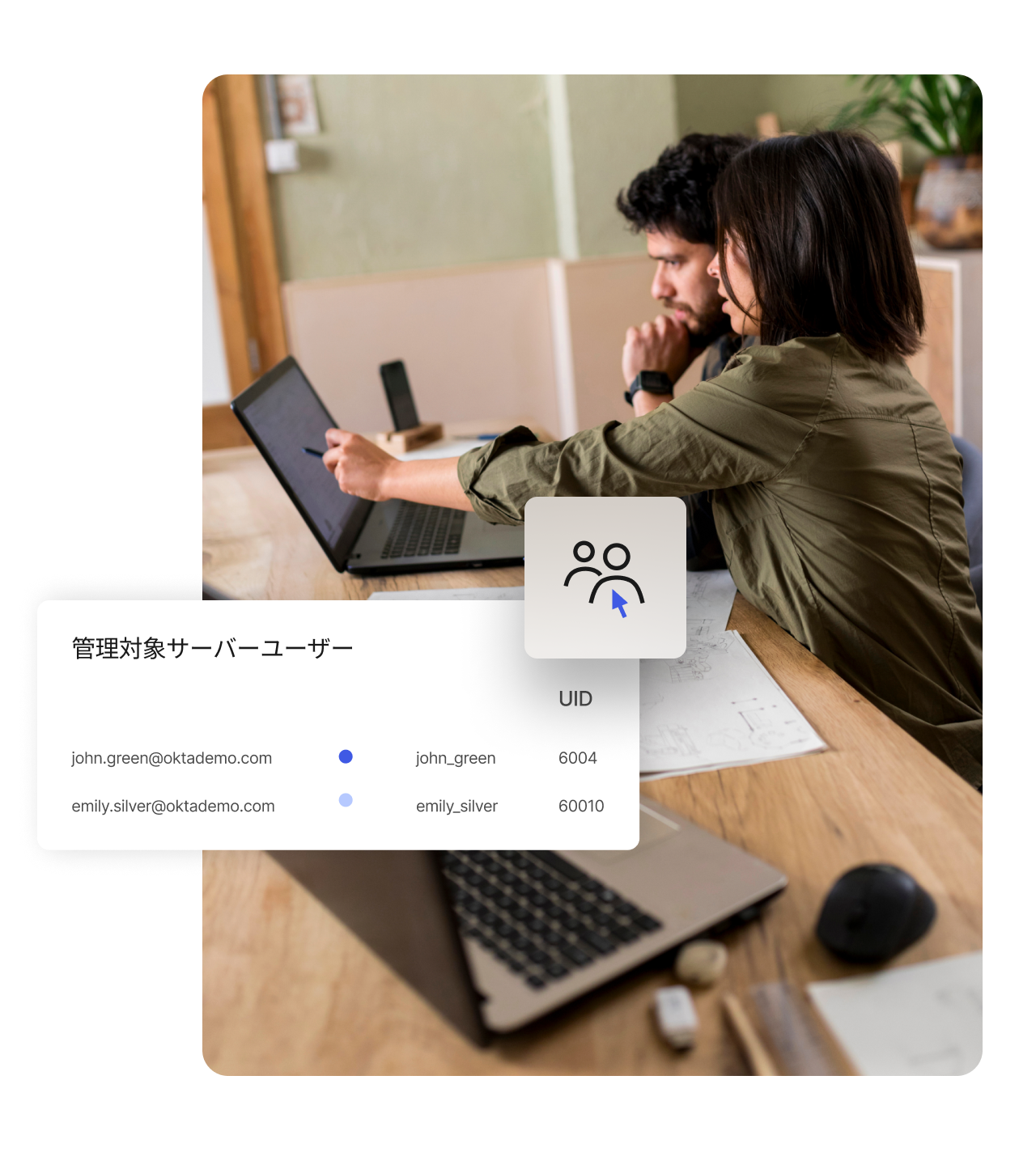 サーバーの管理者アカウントと認証情報を、監査のために追跡・管理する負担を排除します。アイデンティティを使用することで、管理者ユーザーが共有アカウントではなく、Oktaユーザーアカウントを使用してサーバーにログインできるため、ロールベースのアクセス制御と監査ログを調整できます。