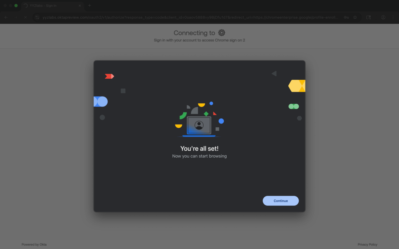 Okta e Google tornam os perfis gerenciados práticos para serem implementados em dispositivos Windows, macOS e Linux gerenciados e não gerenciados. O provisionamento do perfil de trabalho começa com o Okta federando o login no Chrome para que os usuários se autentiquem com suas credenciais corporativas. No primeiro login, um perfil de trabalho gerenciado do Chrome é criado automaticamente e vinculado às políticas da sua organização, eliminando a necessidade de uma solução de gerenciamento de dispositivos. Para obter orientações de configuração passo a passo, consulte Fazer login no Chrome com o Okta, que explica como criar perfis corporativos do Chrome que recebem automaticamente suas políticas configuradas. O exemplo abaixo mostra a experiência do usuário final ao iniciar a configuração do perfil do Chrome no painel do Okta.